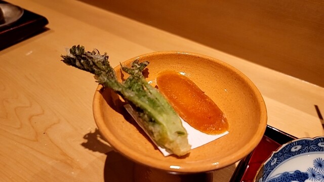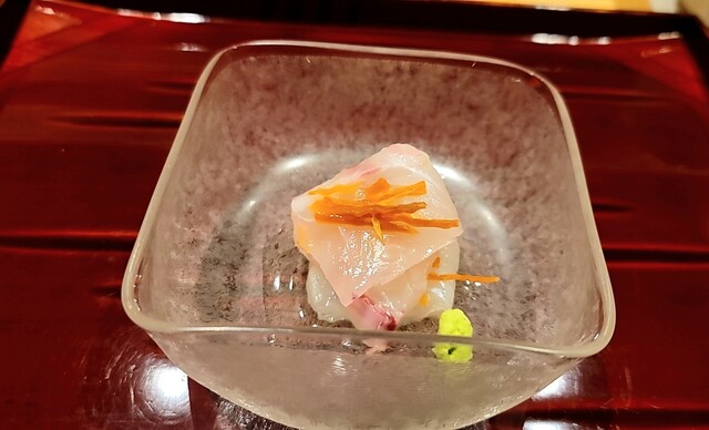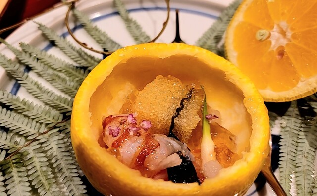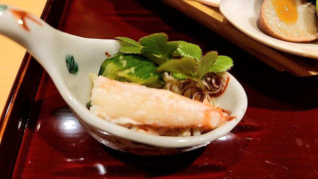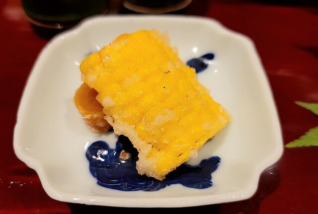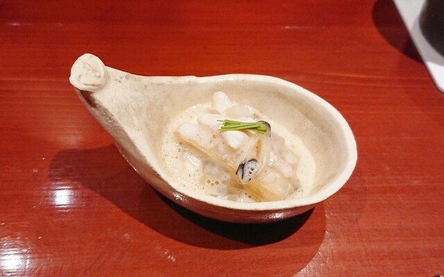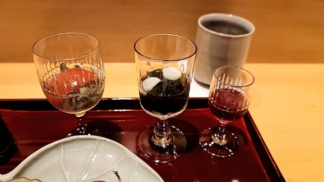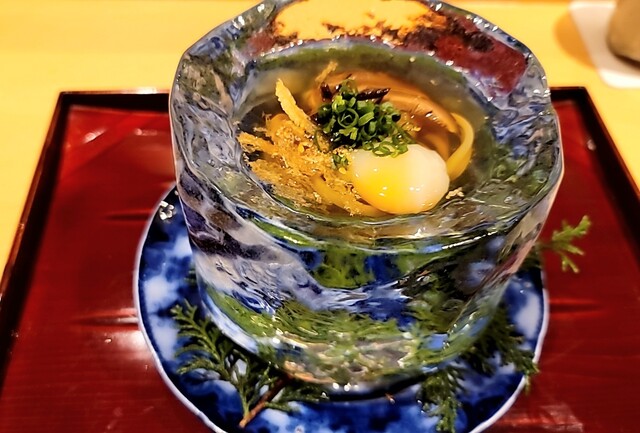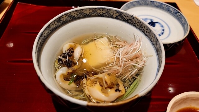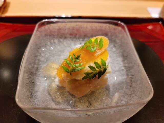 ・鼈の煮凝り、水蛸、ウニ、長芋(焼いてから炊いた)、カリフラワーのすり流し★