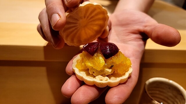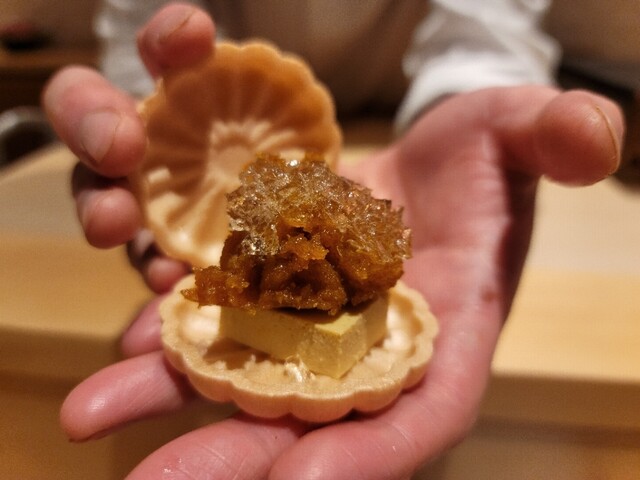 ・フォアグラ最中は、あんぽ柿とウイスキージュレ