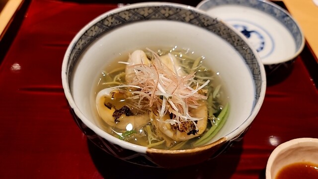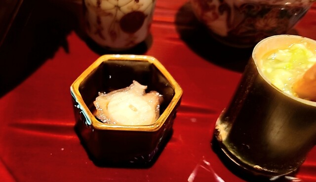 ・焼き北寄貝に枝豆餡と雷干しの白瓜が食感のアクセント・・・竹の猪口