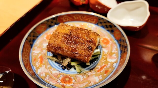 鰻の唐揚げ(蒲焼のタレ)と胡瓜、長芋と茗荷の酢の物と共に。