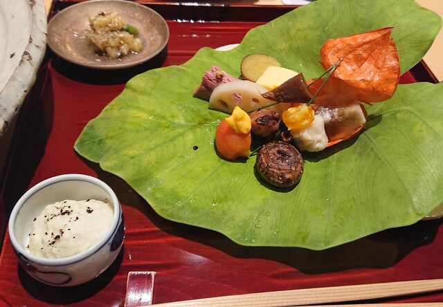 海老芋、堀川牛蒡、海老、旬菊を小さな器に