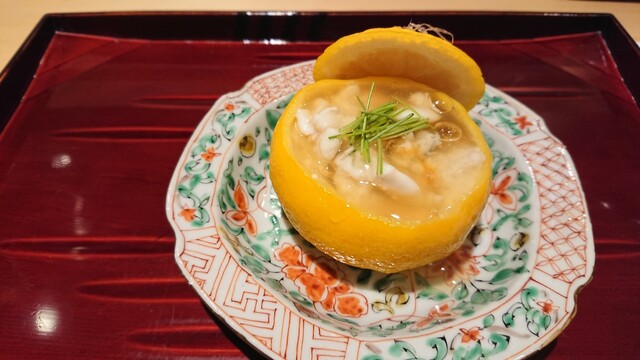 海老の頭と鮃?からとった出汁のジュレに酢橘をかけ、