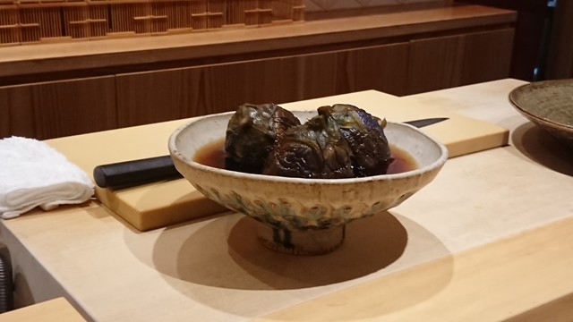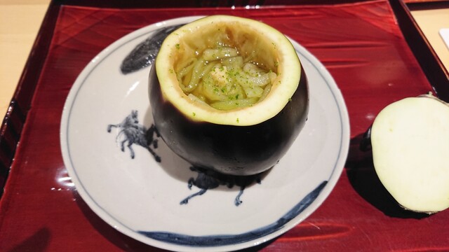 賀茂ナスを葛打ちしたそうめん仕立てで。