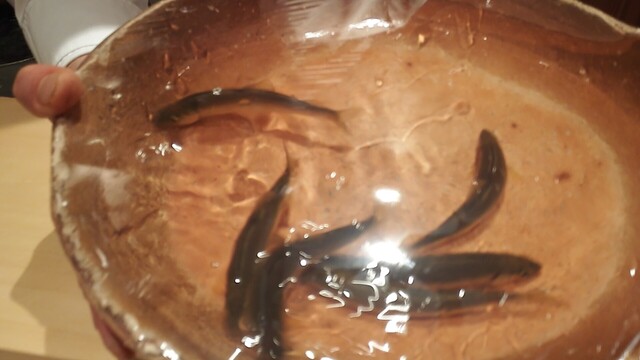 まな板に叩く楽しいショー付き、サッと炙って。
