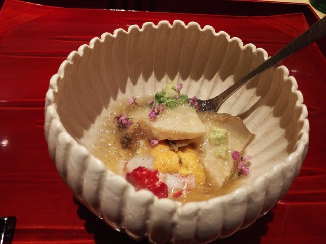 スッポンの煮凝りのジュレにトマトが入った出汁が、