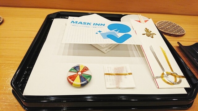 ナフキンの上にマスクホルダー、寿の箸袋には金と銀の水引、カラフルな箸置き。