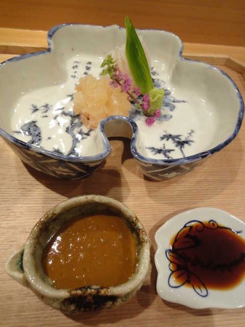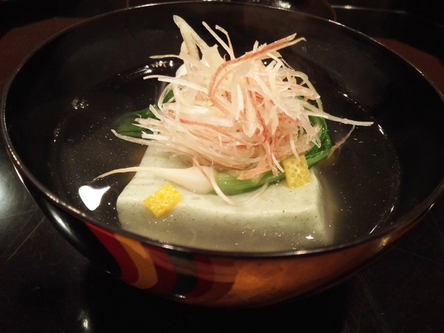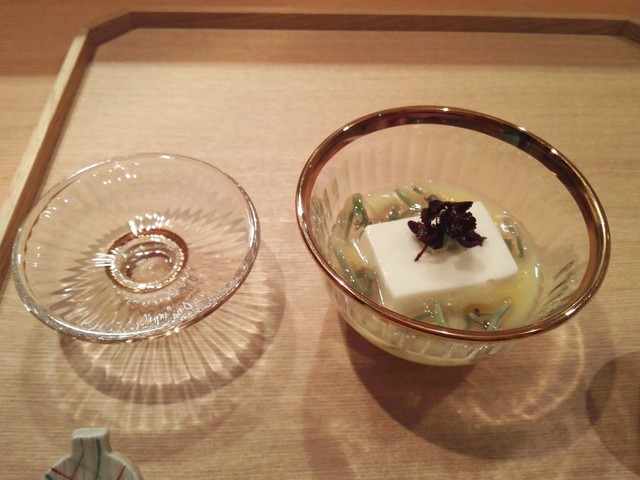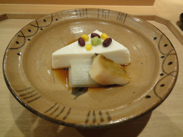 ・ゴマ豆腐にコーンのすり流しとジュンサイ
