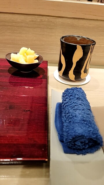 ここで、青いおしぼりとガリが準備される。