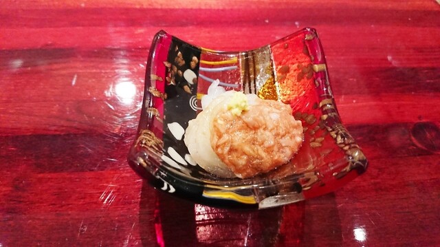 ・手剥き白海老の酒盗あえ・・・赤いガラスの素敵な器(実は女将コレクションらしい)