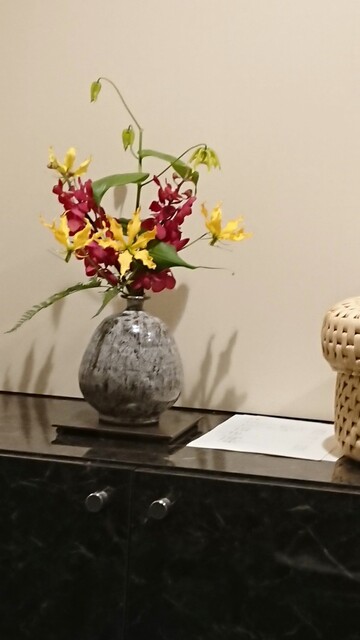 私好みの花瓶に切り花、手前には、胡蝶蘭を浮かべた器。(最後まで花を愛でる)