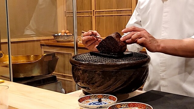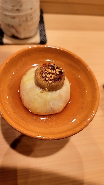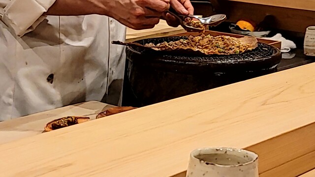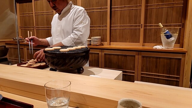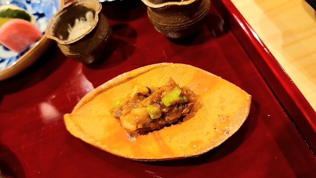 炭の香りが凄く効いて美味しい。伊勢海老の味噌ソースで。