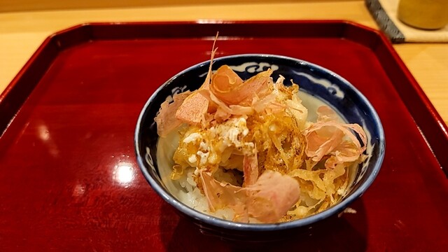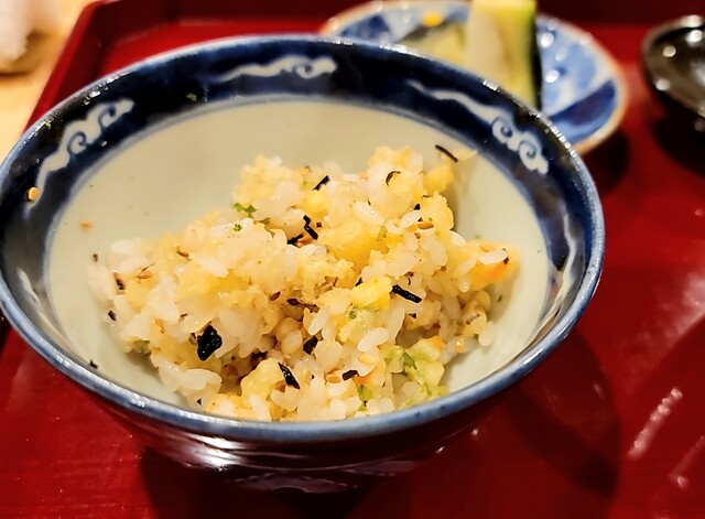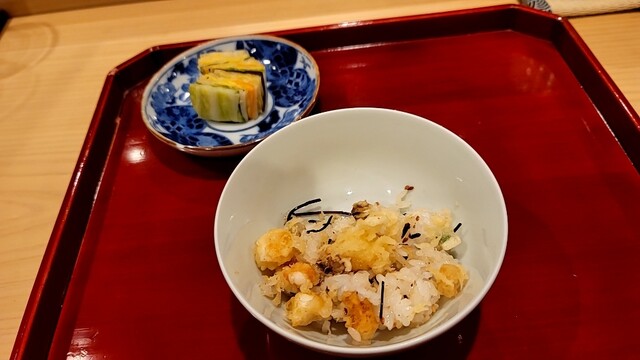 ご飯に天婦羅(かき揚げ?)を混ぜ、味付けは塩昆布と胡麻だけで、柚子のアクセントだそう。