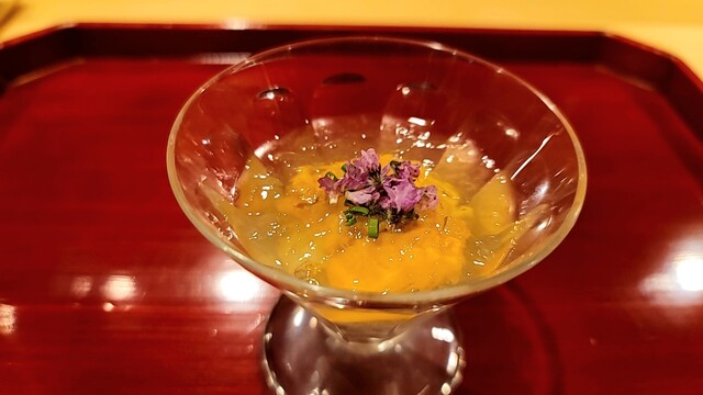 ・白海老、雲丹、スナップエンドウ、カリフラワー、湯葉のコンソメ土佐酢ジュレ