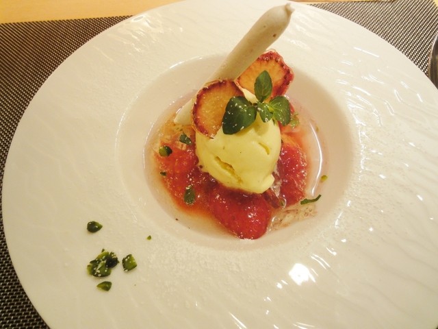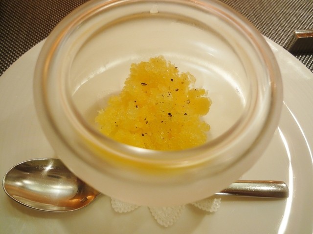 お口直しは普通単純な、爽やか系ソルベが多いのですが、