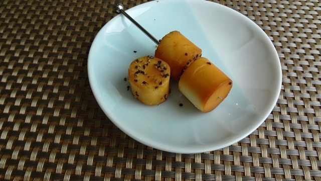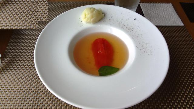 横にはトマトを凍らせた丸ごとシャーベットぽいのが添えられる。