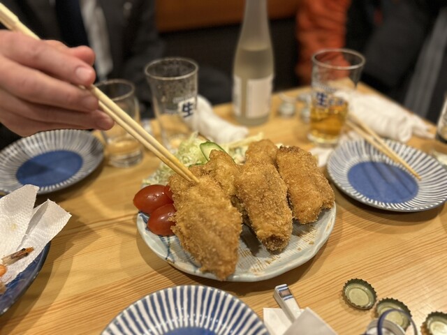 頼んだお料理は、刺身の盛り合わせ、モツ煮、あん肝、鴨鍋、串揚げ、などなど。いずれもとても美味しく丁寧に作られた料理ばかりで、柏崎の皆さんに喜んでいただくことができました。