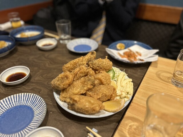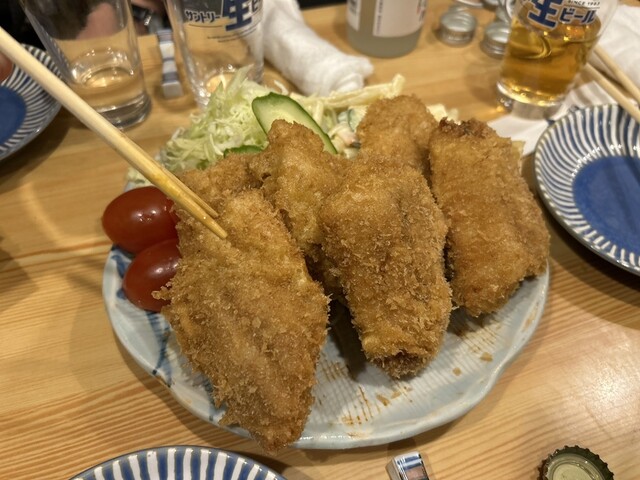 アジのフライに牡蠣のフライがアッツアツのホックホク。そしてデカい。