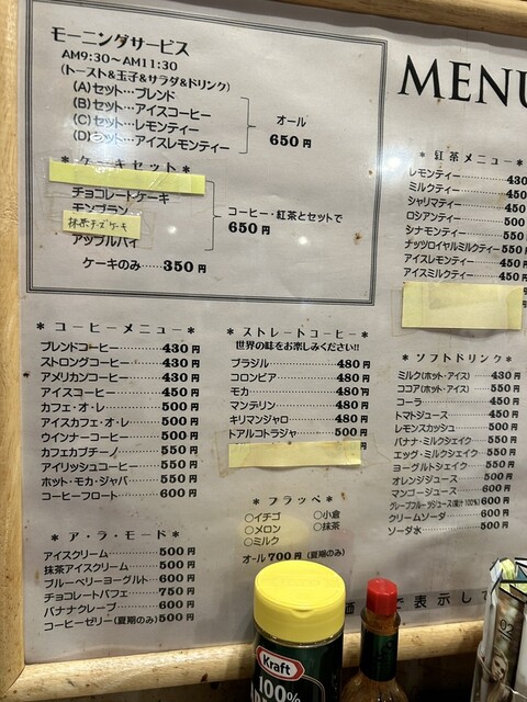 メニューは、テーブルの壁に貼ってあります。取り外せません。メニューの量が半端じゃありません。基本は喫茶店なので、飲み物メニューが大半を占めます。しかしながら、フードメニューも充実しています。これはすごい。よりどりみどりだ。スイーツメニューも豊富で、あれもこれもそれも頼んでみたくなるバリエーションの豊富さです。一部が付箋で隠してあるので、無くなったメニューもあります。モーニングメニューも気になります。