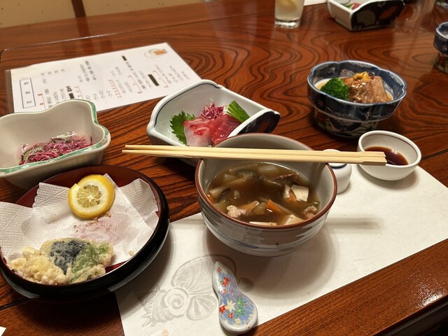 料理の中でも、角煮が良かったです。美味しく食べ応えがありました。のっぺや菊のおひたしに定番の刺身。最後に出てきたそうめんとりんごも素朴でよかった。