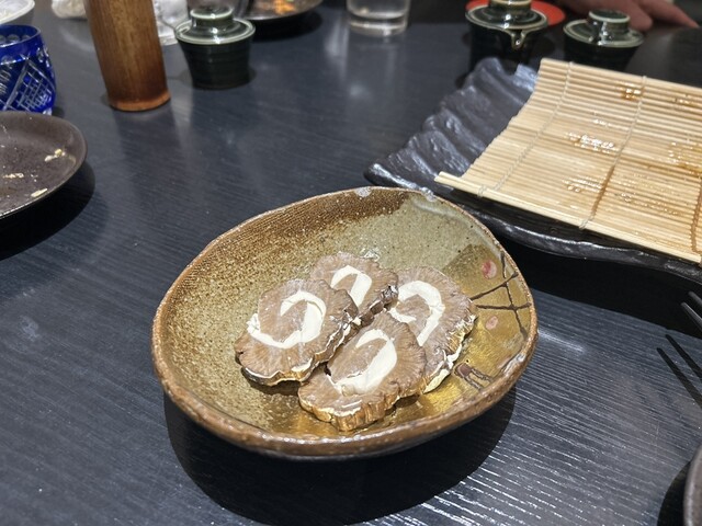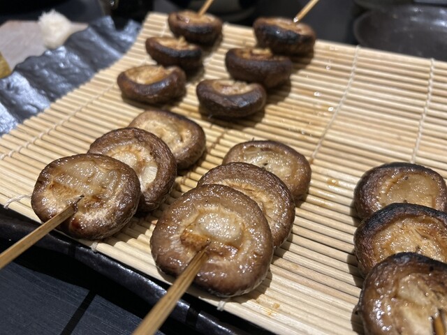 少しして、最初の焼き鳥が届きました。出来立て焼きたてを1つ種類ごとに出してくれるので、これは嬉しい!と思いました。そして、目の前にあるほら、簾のちっちゃいような、あれ、呼び方はわかりませんが、お寿司を巻くときに使う蛇腹みたいなやつの上に置いてくれます。