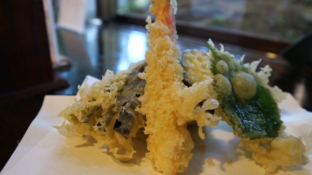 天つゆのお皿もないので天ぷらの油が移らないように数滴上からたらします。天ぷらもさくさくで美味しい。