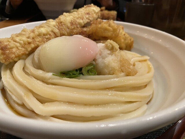 ツヤツヤと輝く極太麺に熱々の天ぷら2つ、そして温玉