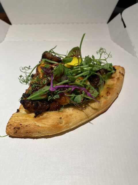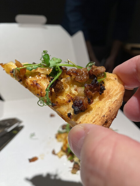 広島県産猪肉を使ったピッツァだった〜、仕上げにパセリソースをかけて完成