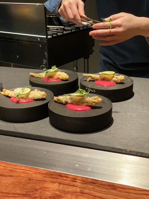ビーツのソースの上で泳ぐ深海魚「メヒカリ」