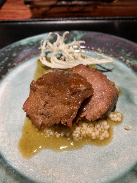 凌: 豚タンを柔らかく煮込みクスクスとともに和風出汁で堪能。個性が光る逸品❣️