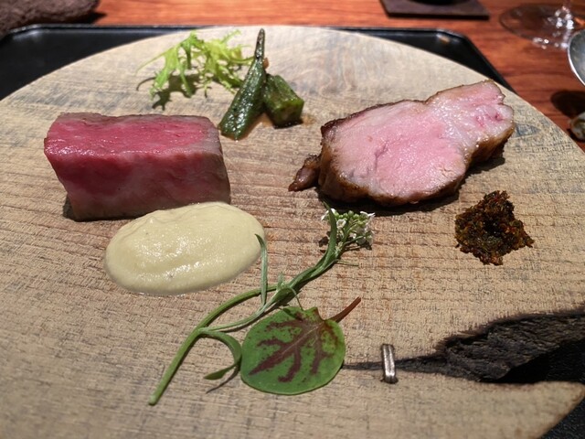 本日の「主」役はこちら。蕪の蒸し焼き、豚肩ロース、黒毛和牛ランプ肉、見た目も美しい