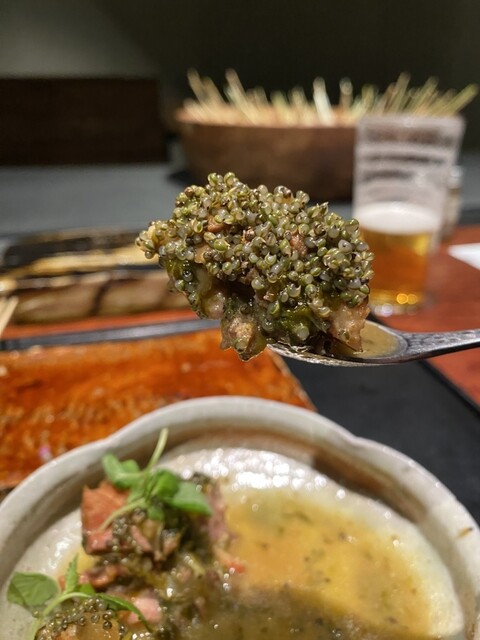 出汁に漬けたせせりに塩昆布を載せている そりゃー美味いやろ〜