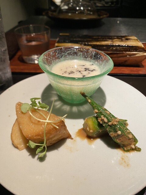 本日のスペシャリテ:京赤地鶏の手羽先の中にもち麦と舞茸を詰めた焼き鳥、ソースは鶏出汁、アオサ、アサリ、トリュフ。ソースと一緒にスプーンで大胆に食べるべし‼️