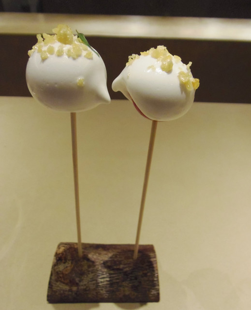北海道平取産トマトのソルベと、レモンやバニラをきかせたシロップにゼラチンを加えて泡立てたものにくるまれています。