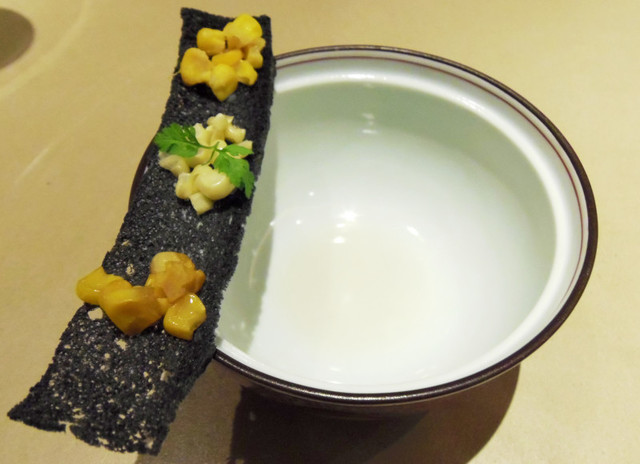 トリュフオイルがスタンバイされていて、あつあつのコーンスープを注いでくれます。