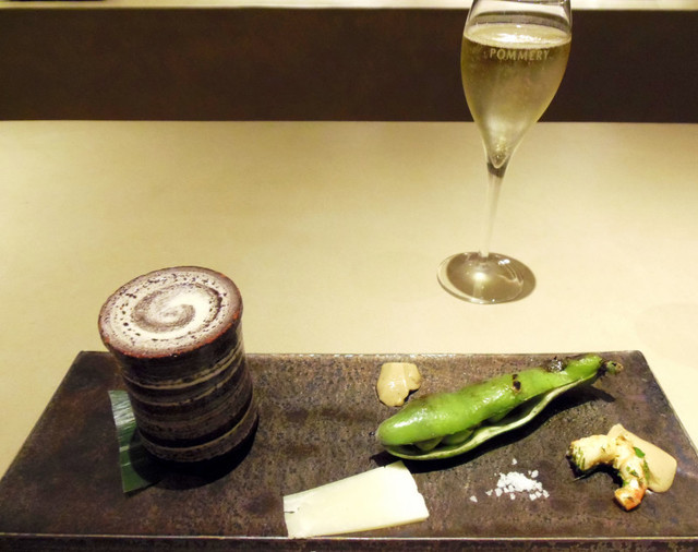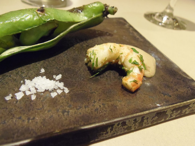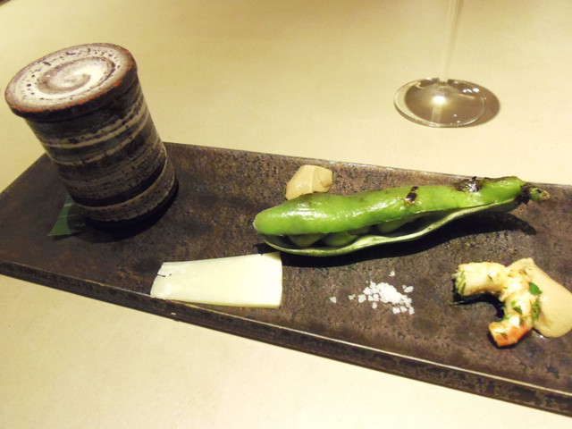 蟹 蟹味噌とそら豆の茶碗蒸し 空豆炭火焼 海老のふらん 北海島海老添え ぺこりーのちーず(三、万葉の詩塩)