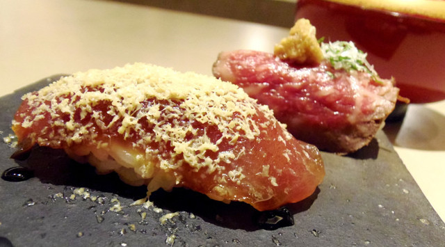 本鮪漬けと、塩・砂糖・日本酒でマリネしたフォアグラが削られてのっています。