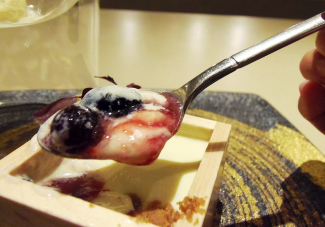 恵庭産ハスカップを種子島純黒糖で作った黒蜜で一度煮てジュレ状にしたものを合わせて。