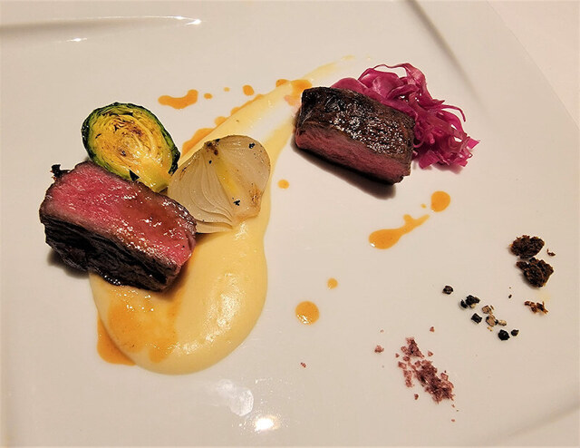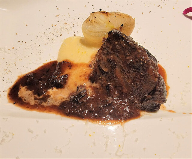 減圧牧草牛の炭火焼、牛頬肉の赤ワイン煮込み~2種盛