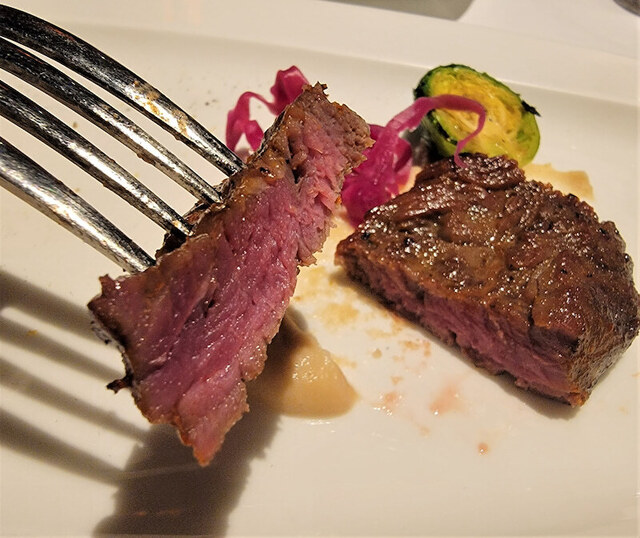 写真右)減圧牧草牛のかいのみ炭火焼は、歯ごたえあってやわらかく、にんにくの風味もあり。