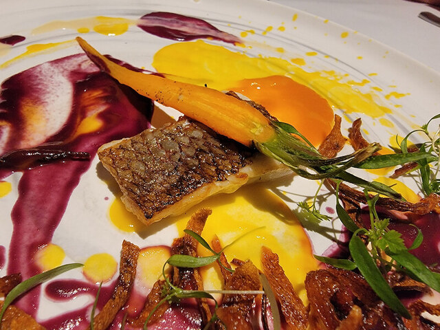 金時人参と西洋人参と紫人参のソースで、パレットみたいな彩りの一皿。