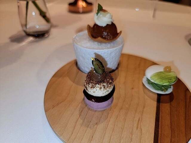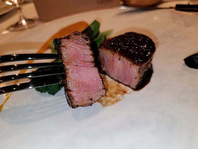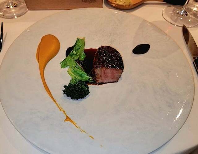 伊賀牛、(松阪牛のもと牛)、赤ワインのソース、ブロッコリーニ(細長いブロッコリー)、サムライ椎茸、芽キャベツ、さやいんげんかぼちゃのペーストと、黒ニンニクのペーストは発酵しているので、レーズンのような風味。