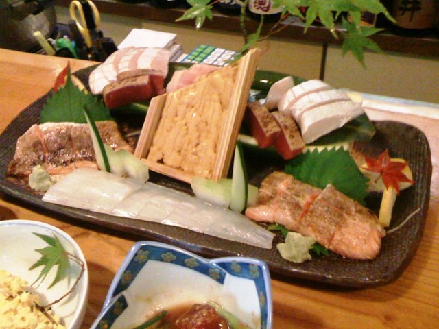 お刺身の盛り合わせ・・秋刀魚、カンパチ、烏賊、鮭の腹身炙り、大トロ、の5色盛りです、、