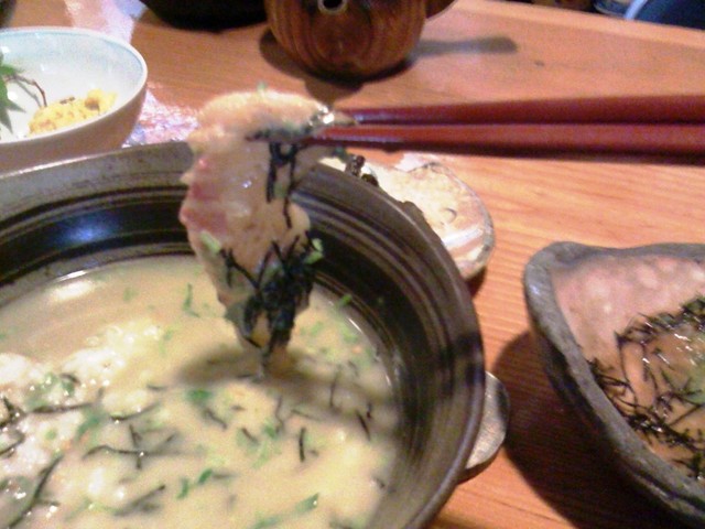ゴマダレに漬けた鯛をお茶漬けでしゃぶしゃぶして頂きます。ちなみに鯛茶漬けは前日予約です。