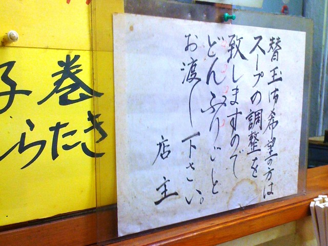 待っている間に店内を見渡すと、替玉の方法が張り紙に書いてありまして「替玉を希望の方はスープの調整を致しますので、どんぶりごとお渡し下さい、店主」