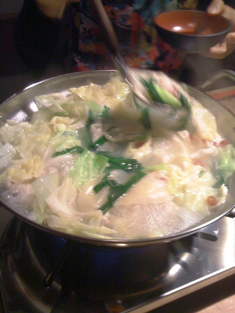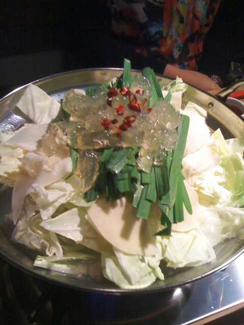 メインのモツ鍋です(白モツ、コラーゲン入り)♪