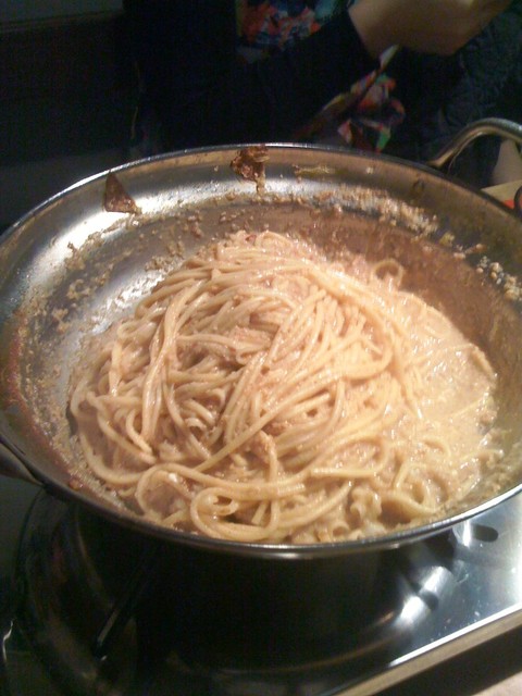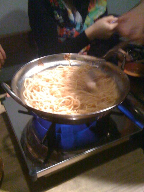 チャンポン玉を投入コンロの火を強めます。鍋の出汁を麺に全て吸わせます、、焼きそば一歩手前状態までに、、そこへモンドセレクション金賞の擂りゴマを大量投入、、胡麻の美味しい風味が鼻腔を刺激します、、(><)ノたまらん