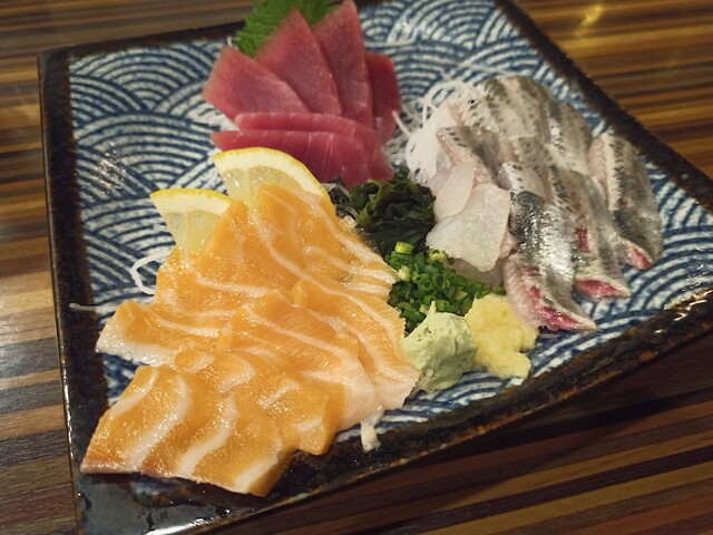 刺身は3点盛り(まぐろ・いわし・とろサーモン)を選択し、こちらをアテにゆっくりと~。