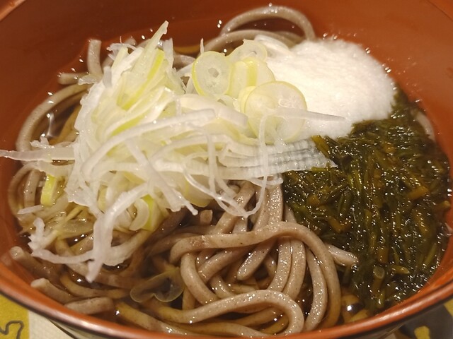 ながもそば はミニサイズの器で提供されるもので〆には最適解。佐渡の海で獲れる"アカモク"のことをご当地では"ながも"と呼ぶそうですが、粘り気がありながらシャキシャキした食感で、するすると食べることができます。