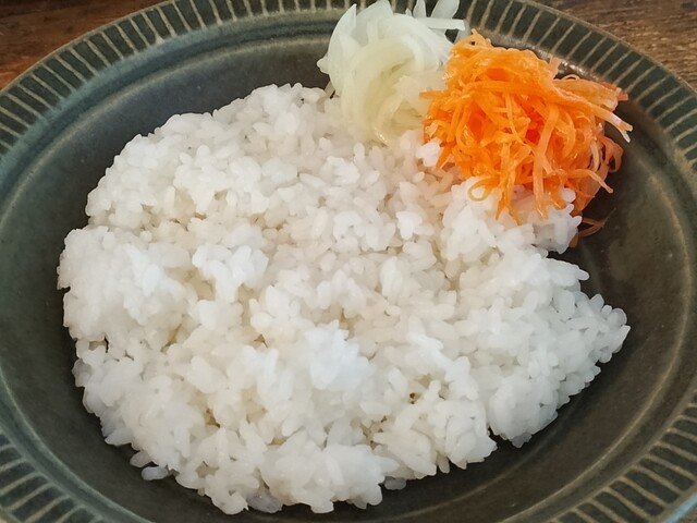 ライスも水加減が調整されていて、程よい粘りがあり、どちらのカレーにもよく合います。付け合わせのたまねぎとにんじんの酢漬けもお口直しにちょうど良く。