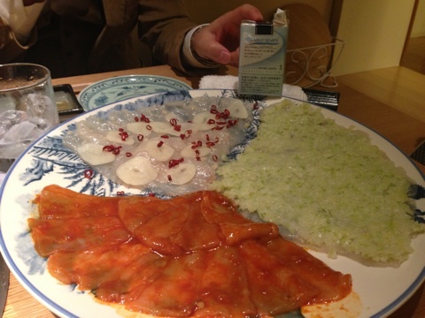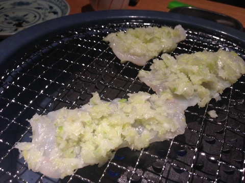 やきふぐはにんにく、ちょっと辛目のたれ、ねぎ塩っぽいタレと